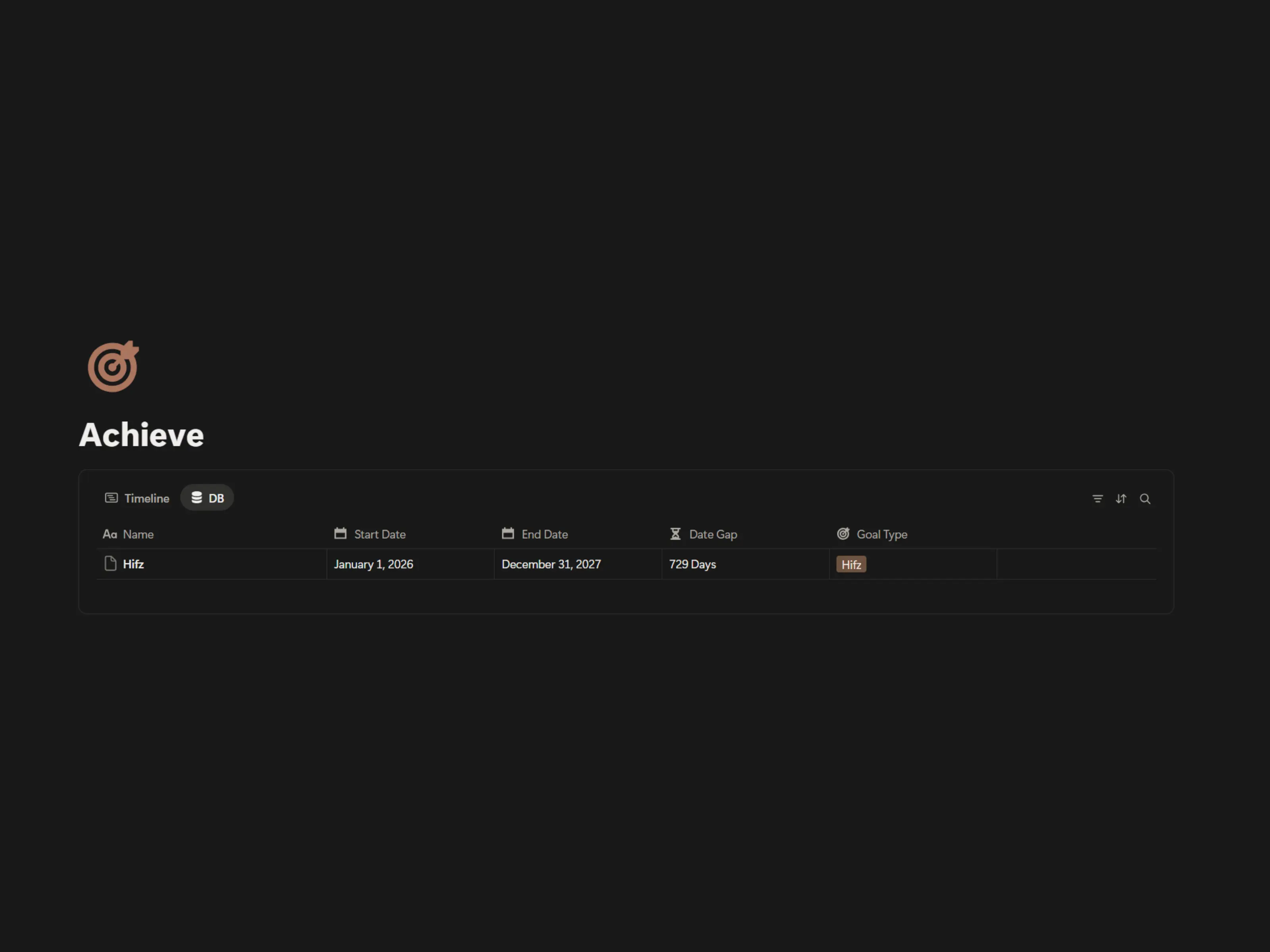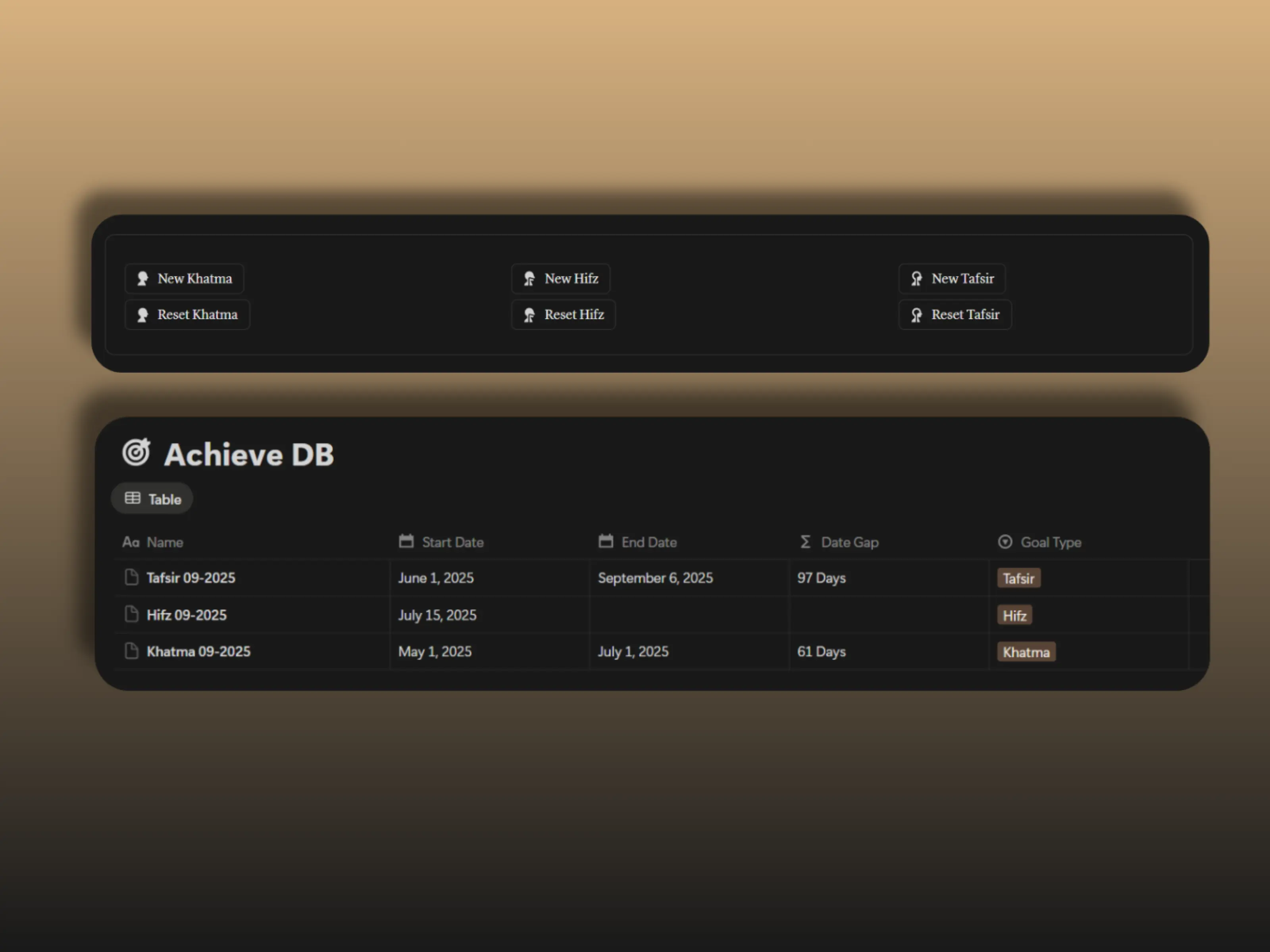 Start a new Khatma, Tafsir, or Hifz with a single click. Set start and end dates, track your progress from beginning to completion, and document every milestone through the Achievements database to stay consistent and motivated throughout your Quran journey.