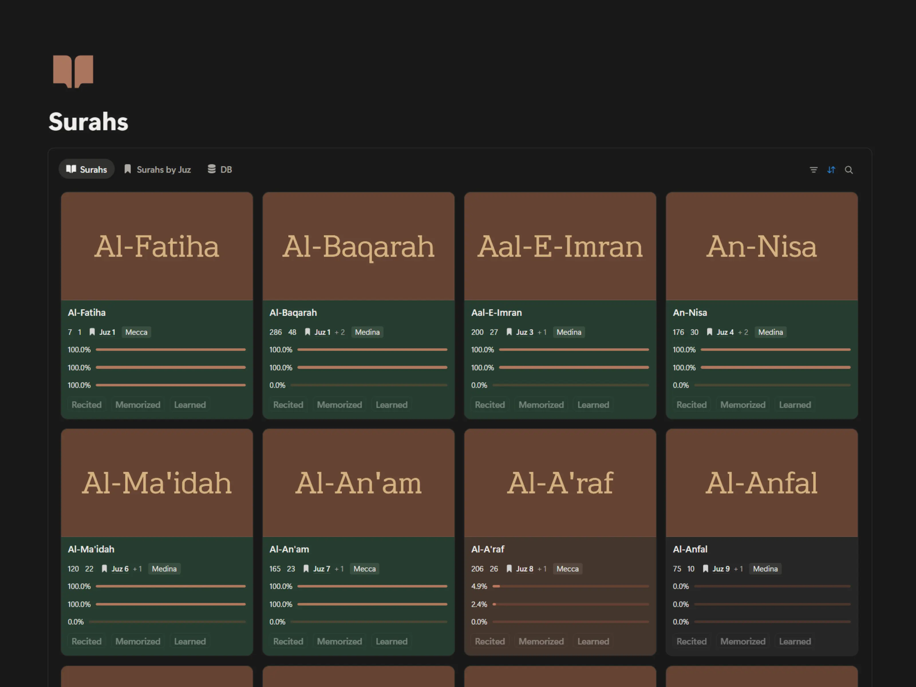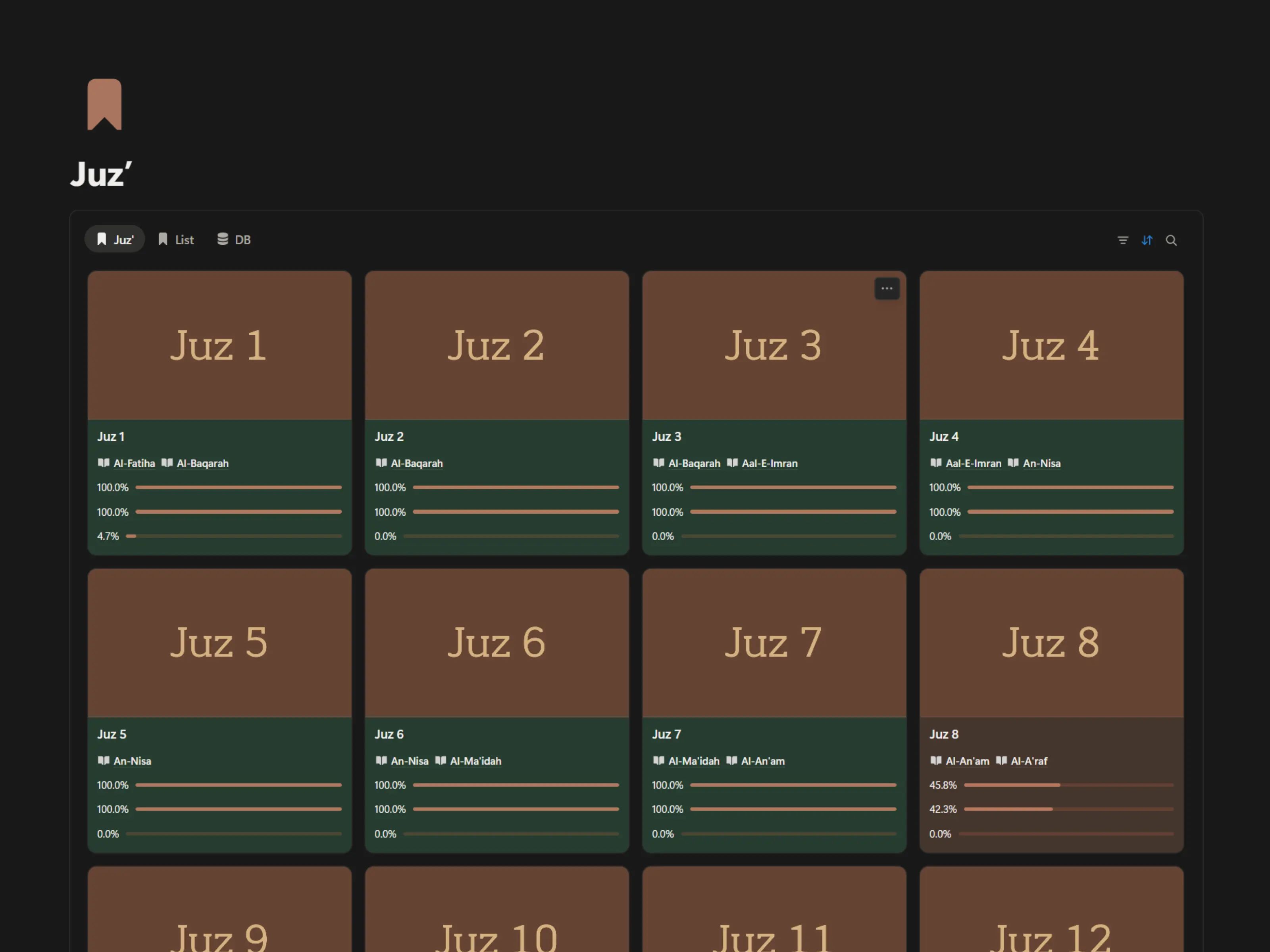 All 30 Juz with detailed progress, verse counts, and linked Surahs for a structured view of your recitation, memorization, or tafsir.