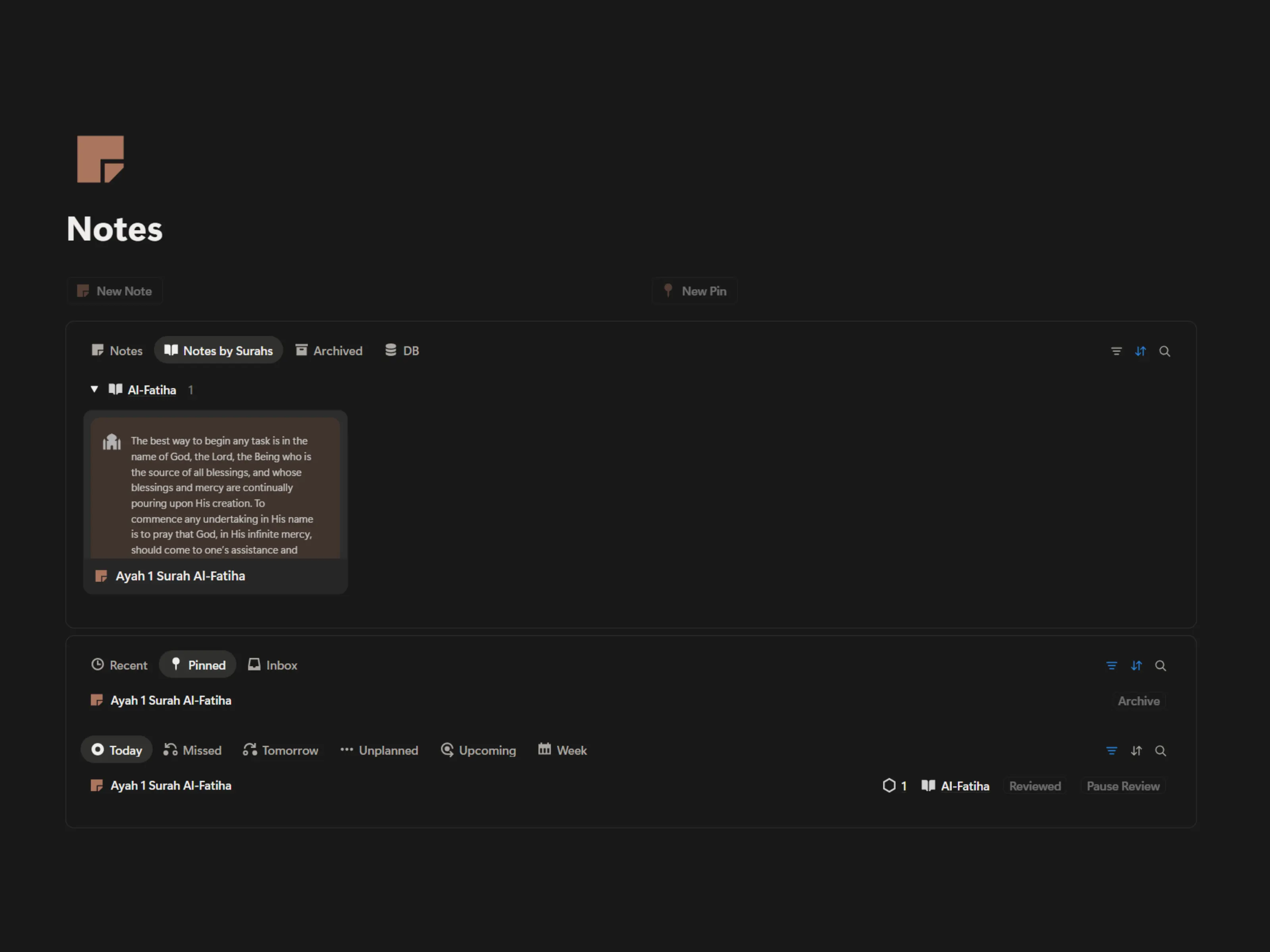 Create personal notes linked to specific verses — a dedicated space for tadabbur, insights, reflections, and spaced repetition to reinforce understanding over time.