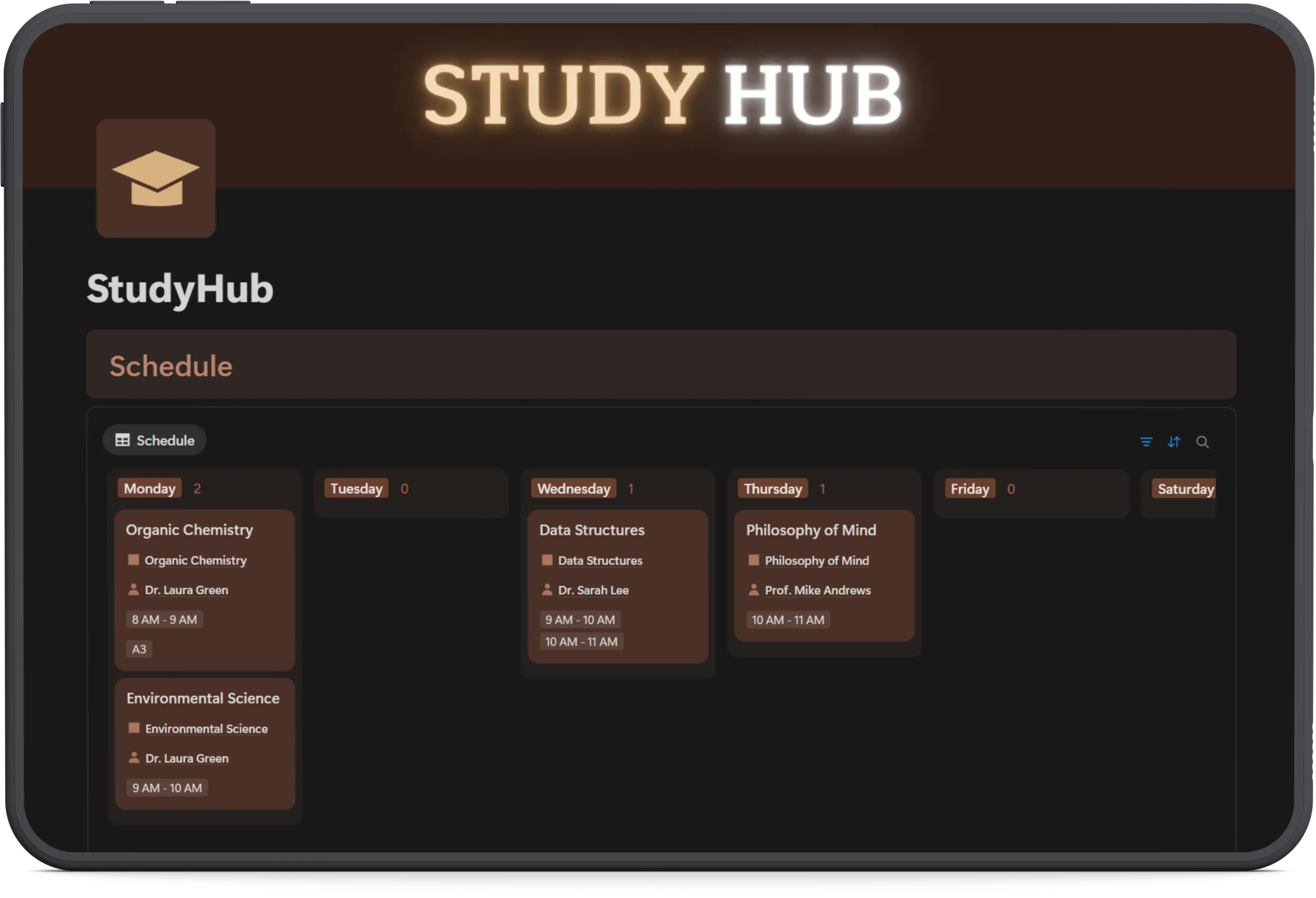 View all your courses alongside your weekly schedule. Stay on track with what you're learning and exactly when you need to focus on it — all in one smart layout.