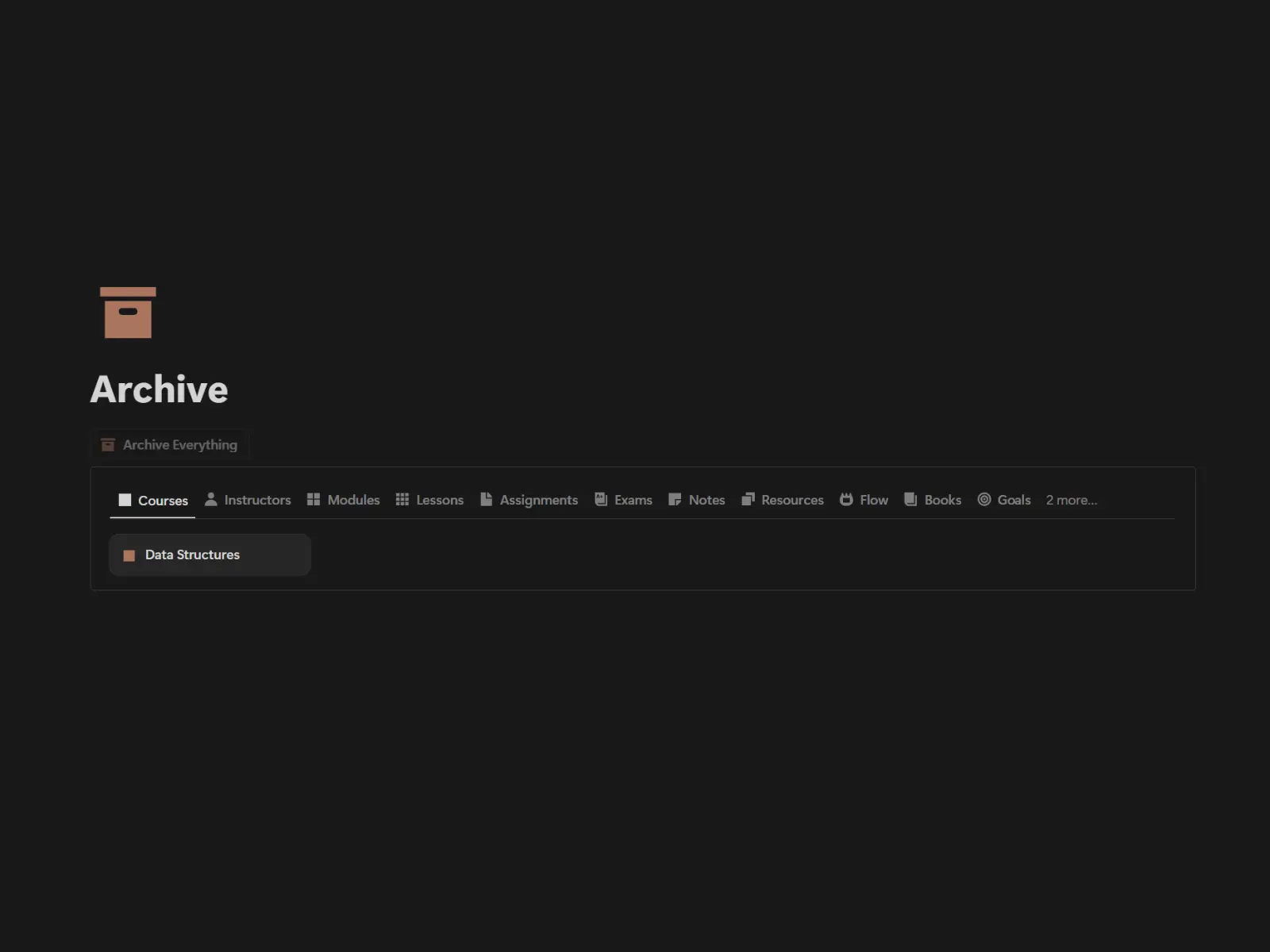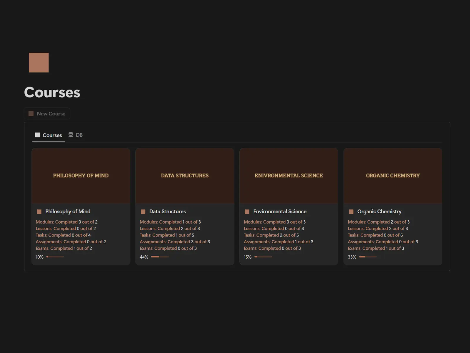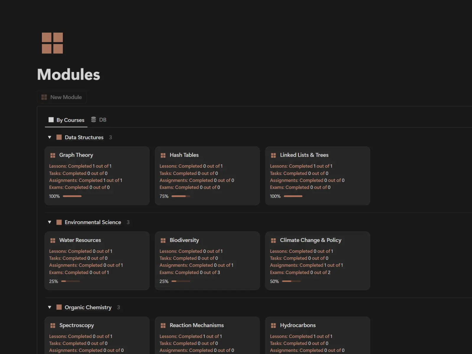 A modular system with dedicated databases for courses, tasks, exams, instructors, resources, notes, and more.