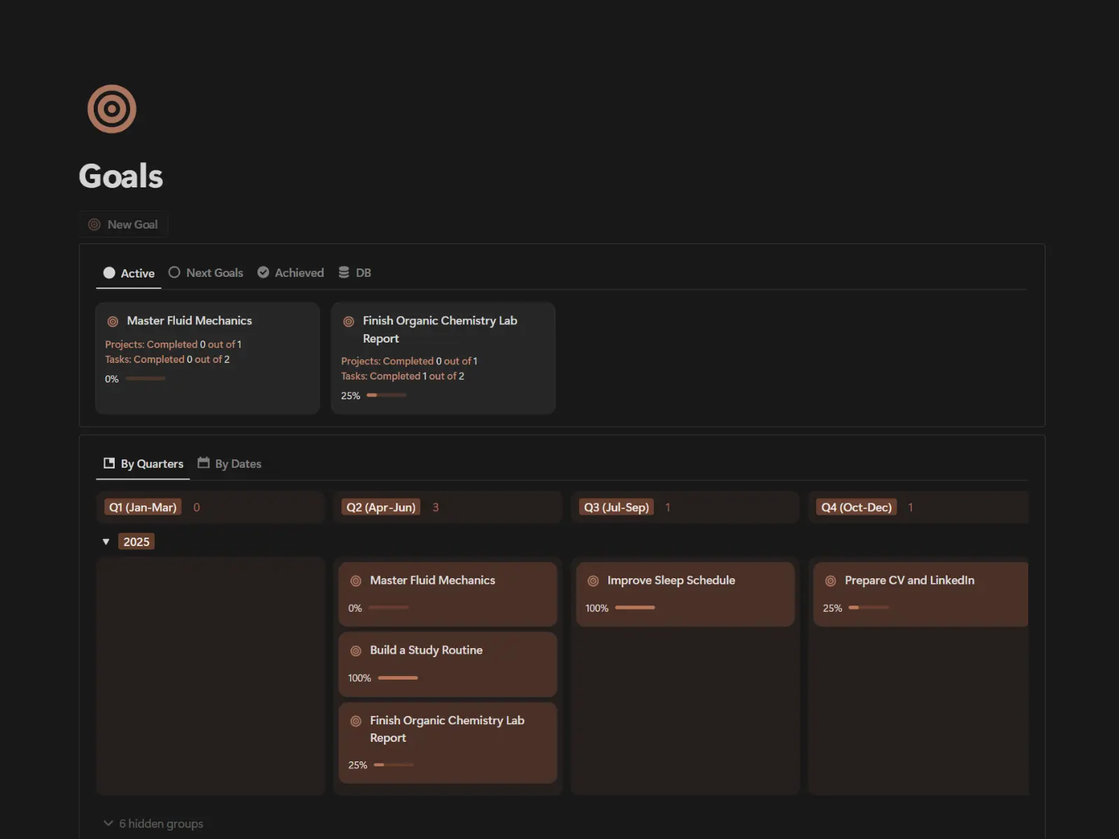 Turn your academic vision into action. Track long-term goals and manage projects with clear steps, deadlines, and progress indicators.
