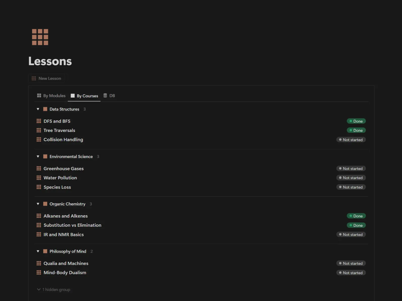 Track individual lessons, their topics, progress, and related materials — all connected to your modules and courses.