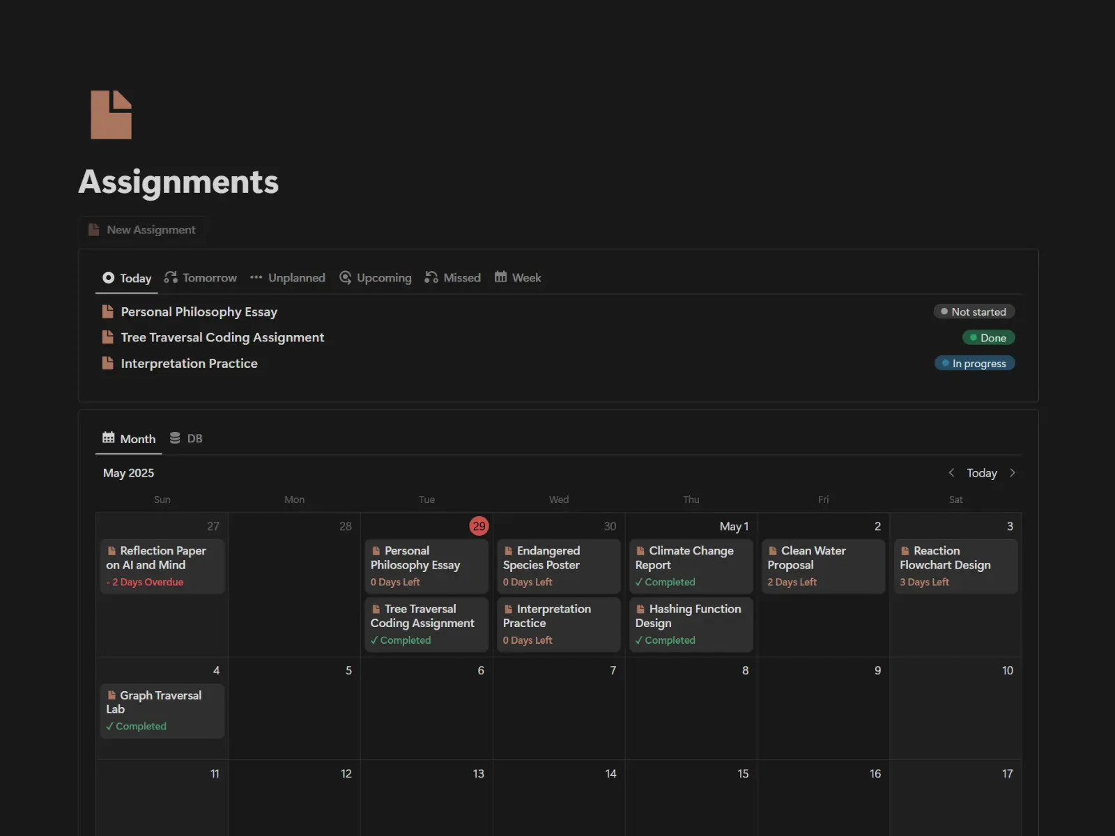 Stay on top of your tasks, assignments, and exams with smart date filters like Today, Upcoming, and Missed.