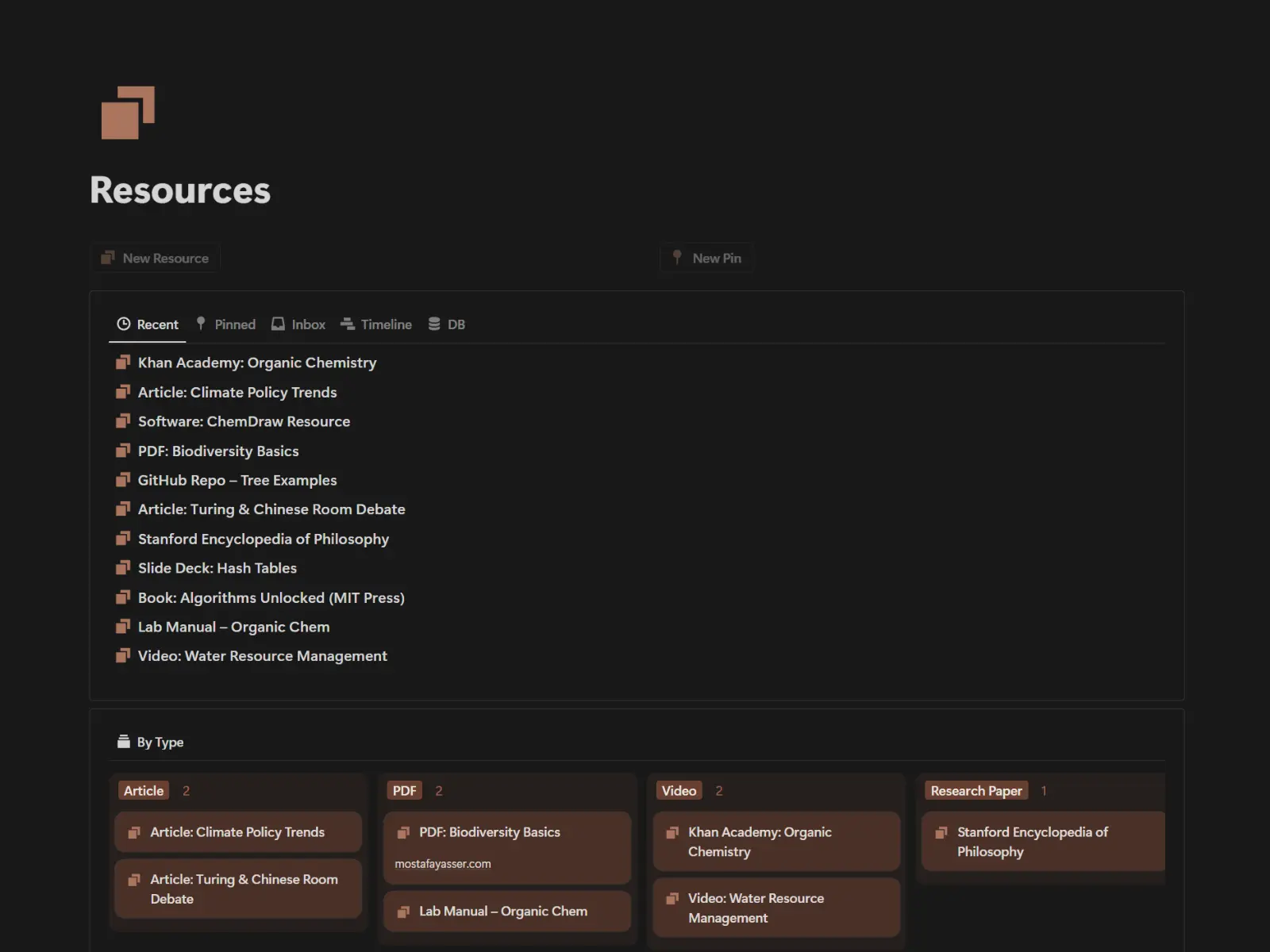 Store useful materials like PDFs, links, and videos, categorized and tagged for easy access.